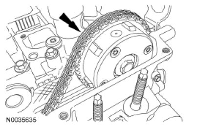 6. NOTE: Releasing the tensioner arm will remove the slack from the timing chain.