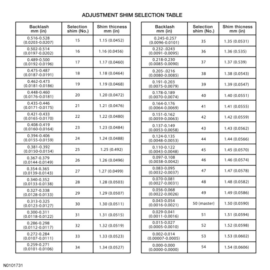 Using the backlash measurement, select the proper shims from the Adjustment Shim Selection Table.