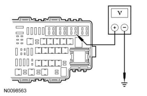 - Measure the voltage between ground and auxiliary coolant flow pump relay socket, circuit SBB13 (GY/RD).