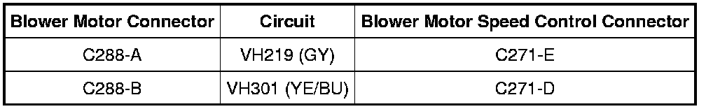- Measure the resistance between blower motor C288-A, circuit VH219 (GY), harness side and blower motor C288-B, circuit VH301 (YE/BU), harness side.