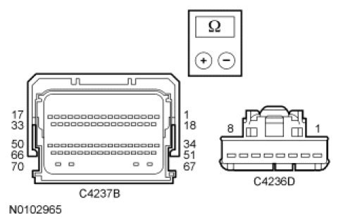- Measure the resistance between high-voltage BEC C4236D-1, circuit J1-A58, harness side and BECM C4237B-58, circuit J1-A58, harness side; and between high-voltage BEC C4236D-2, circuit J1-A59 harness side and BECM C4237B-59, circuit J1-A59, harness side.