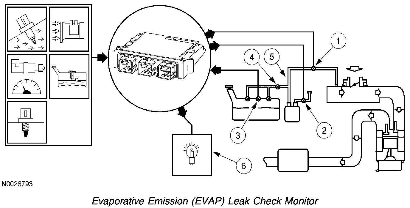 EVAPORATIVE EMISSION (EVAP) LEAK CHECK MONITORThe EVAP leak check monitor is an on-board strategy designed to detect a leak from a hole (opening) equal to or greater than 0.508 mm (0.020 inch) in the enhanced EVAP system. The correct function of the individual components of the enhanced EVAP system, as well as its ability to flow fuel vapor to the engine, is also examined. The EVAP leak check monitor relies on the individual components of the enhanced EVAP system to either allow a natural vacuum to occur in the fuel tank or apply engine vacuum to the fuel tank and then seal the entire enhanced EVAP system from the atmosphere. The fuel tank pressure is then monitored to determine the total vacuum lost (bleed-up) for a calibrated period of time. Inputs from the cylinder head temperature (CHT), intake air temperature (IAT), mass air flow (MAF), vehicle speed, fuel level input (FLI) and fuel tank pressure (FTP) sensors are required to enable the EVAP leak check monitor.