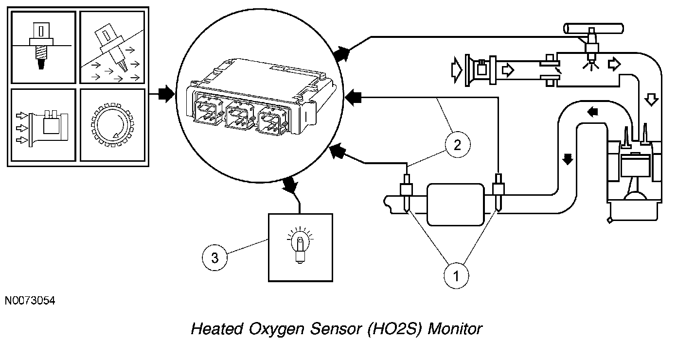 HEATED OXYGEN SENSOR (HO2S) MONITORThe HO2S monitor is an on-board strategy designed to monitor the HO2Ss for concerns or deterioration which can affect emissions. The front or stream 1 HO2S is checked for correct output voltage and response rate. Response rate is the time it takes to switch from lean to rich or rich to lean. The rear or stream 2 HO2S is monitored for correct output voltage and is used for catalyst monitoring and fore-aft oxygen sensor (FAOS) control. Input is required from the cylinder head temperature (CHT), intake air temperature (IAT), mass air flow (MAF) and crankshaft position (CKP) sensors to activate the HO2S monitor. The fuel system monitor and misfire detection monitor must also complete successfully before the HO2S monitor is enabled.