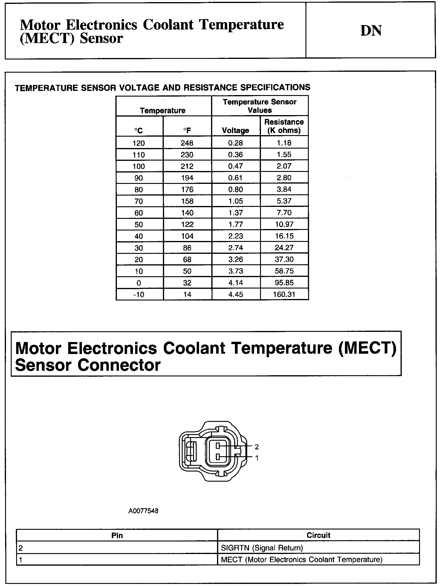 Temperature Sensor  Voltage And Resistance Specfications And Motor Electronics Coolant Temperature (MECT) Sensor Connector: