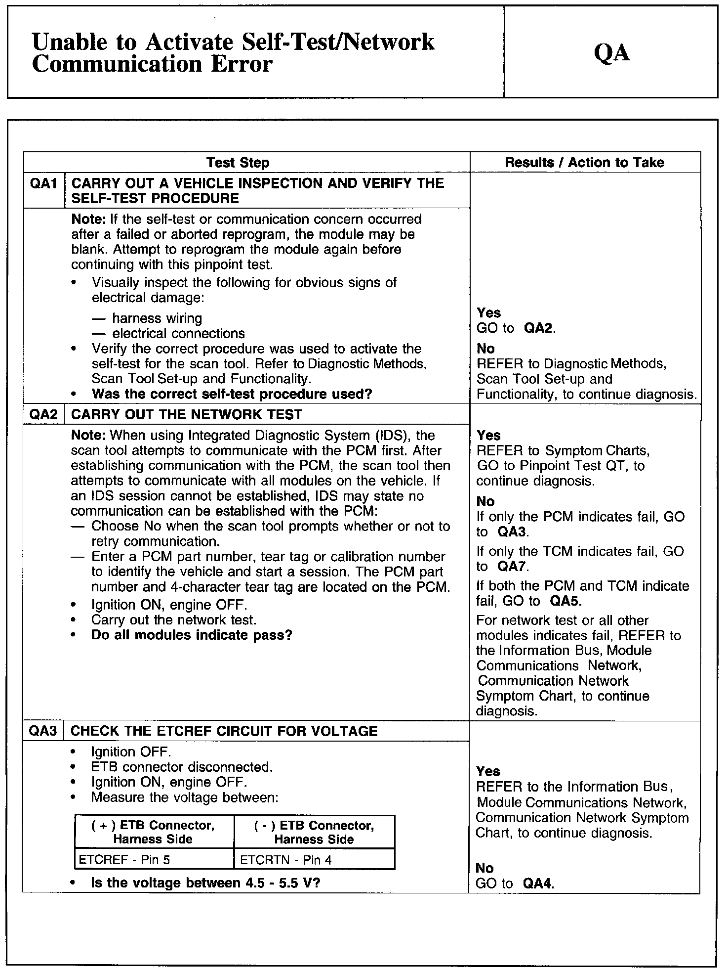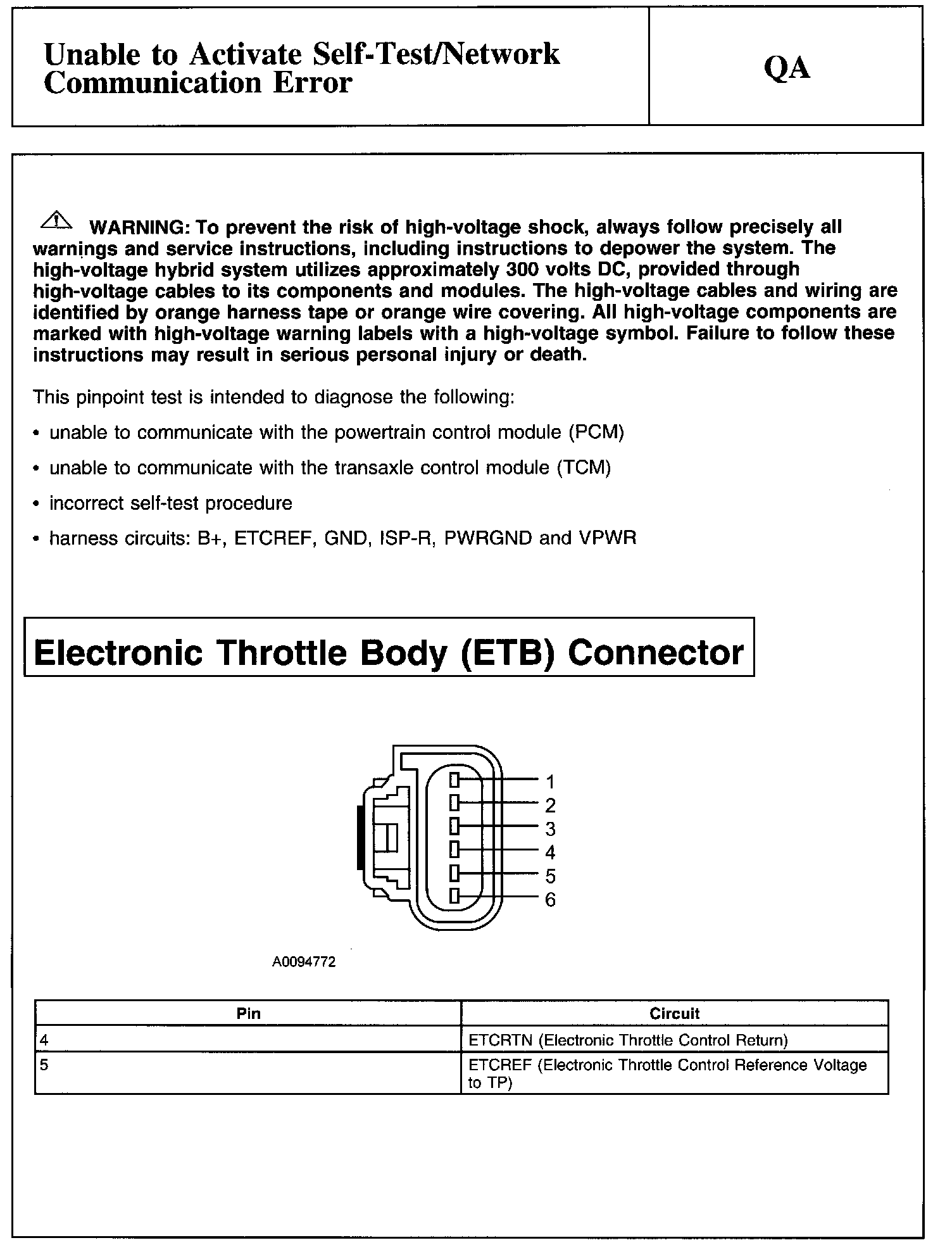 PINPOINT TEST QA: UNABLE TO ACTIVATE SELF-TEST/NETWORK COMMUNICATION ERRORWarning And Electronic Throttle Body (ETB) Connector: