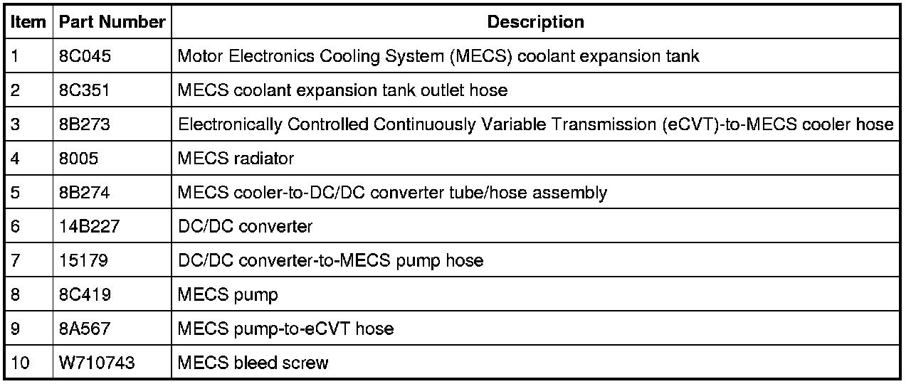 The vehicle uses a pump driven cooling system, referred to as the Motor Electronics Cooling System (MECS) pump, to transfer heat generated by the Electronically Controlled Continuously Variable Transmission (eCVT) and the Hybrid Electric Vehicle (HEV) DC/DC converter to the atmosphere. The system uses a coolant-to-air radiator design.