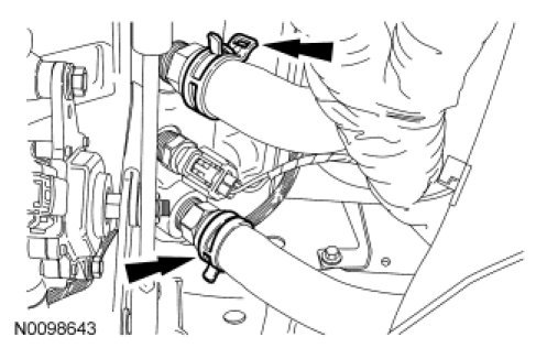 4. Compress the constant tension clamps and remove the hoses from the transaxle to allow the coolant to drain.