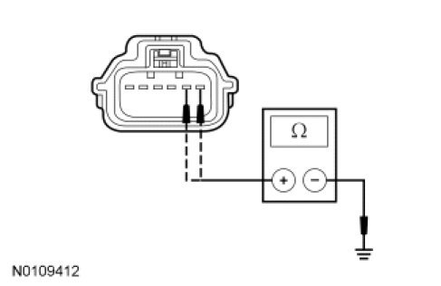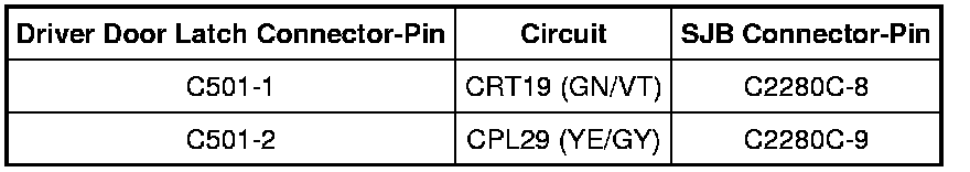 - Measure the resistance between the driver door latch C501-1, circuit CRT19 (GN/VT), harness side and ground, and between the driver door latch C501-2, circuit CPL29 (YE/GY), harness side and ground.