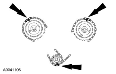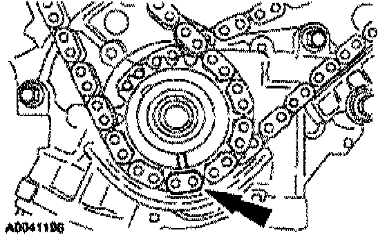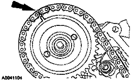 24. Position the RH (outer) timing chain on the crankshaft sprocket, aligning the colored link with the timing marks on the sprocket.