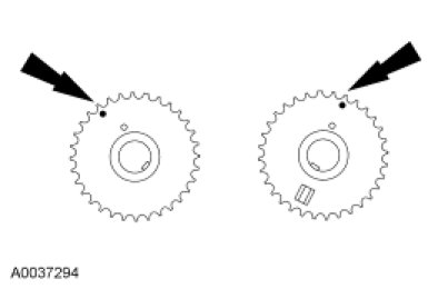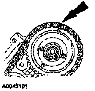 37. Install the LH timing chain on the camshaft sprocket, aligning the 2 colored links with the timing mark on the sprocket.