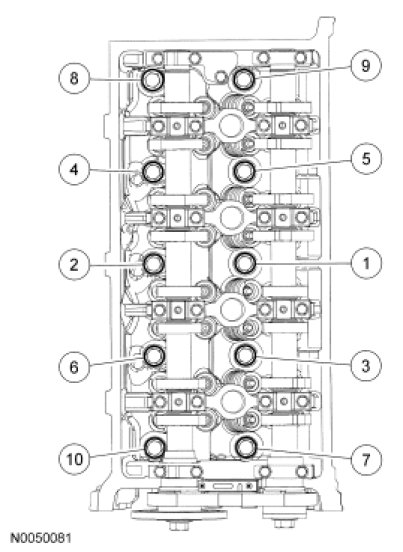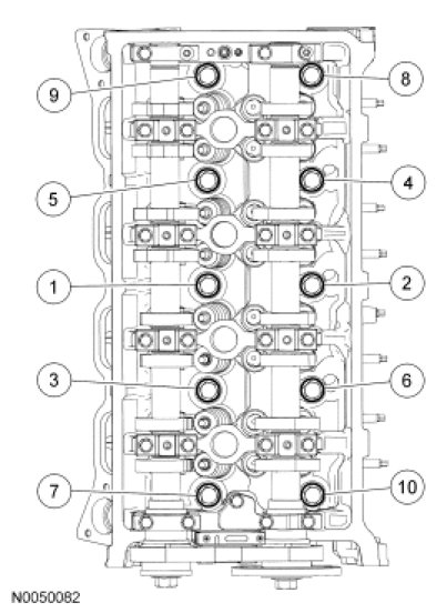 12. Tighten the 10 new outside vertical main bearing cap fasteners in the sequence shown, in 3 stages.
