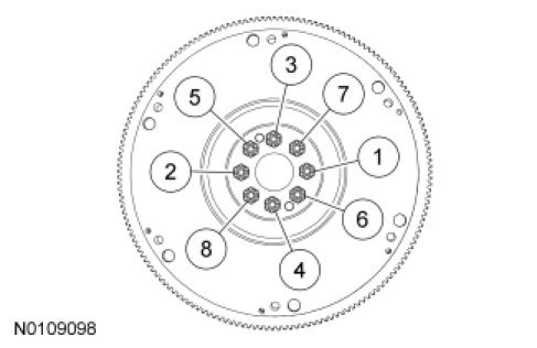 2. Tighten the flywheel bolts evenly in the sequence shown to fully seat the flywheel on the crankshaft pilot.