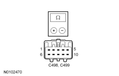 - Measure the resistance between the LH rear lamp C498-7, circuit CLS54 (BU/OG), harness side and ground: or between the RH rear Lamp C499-7, circuit CLS55 (GN/BU), harness side and ground.