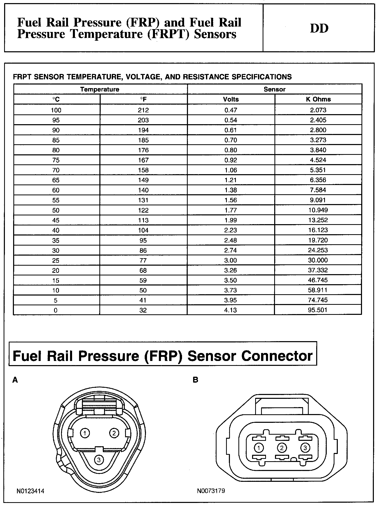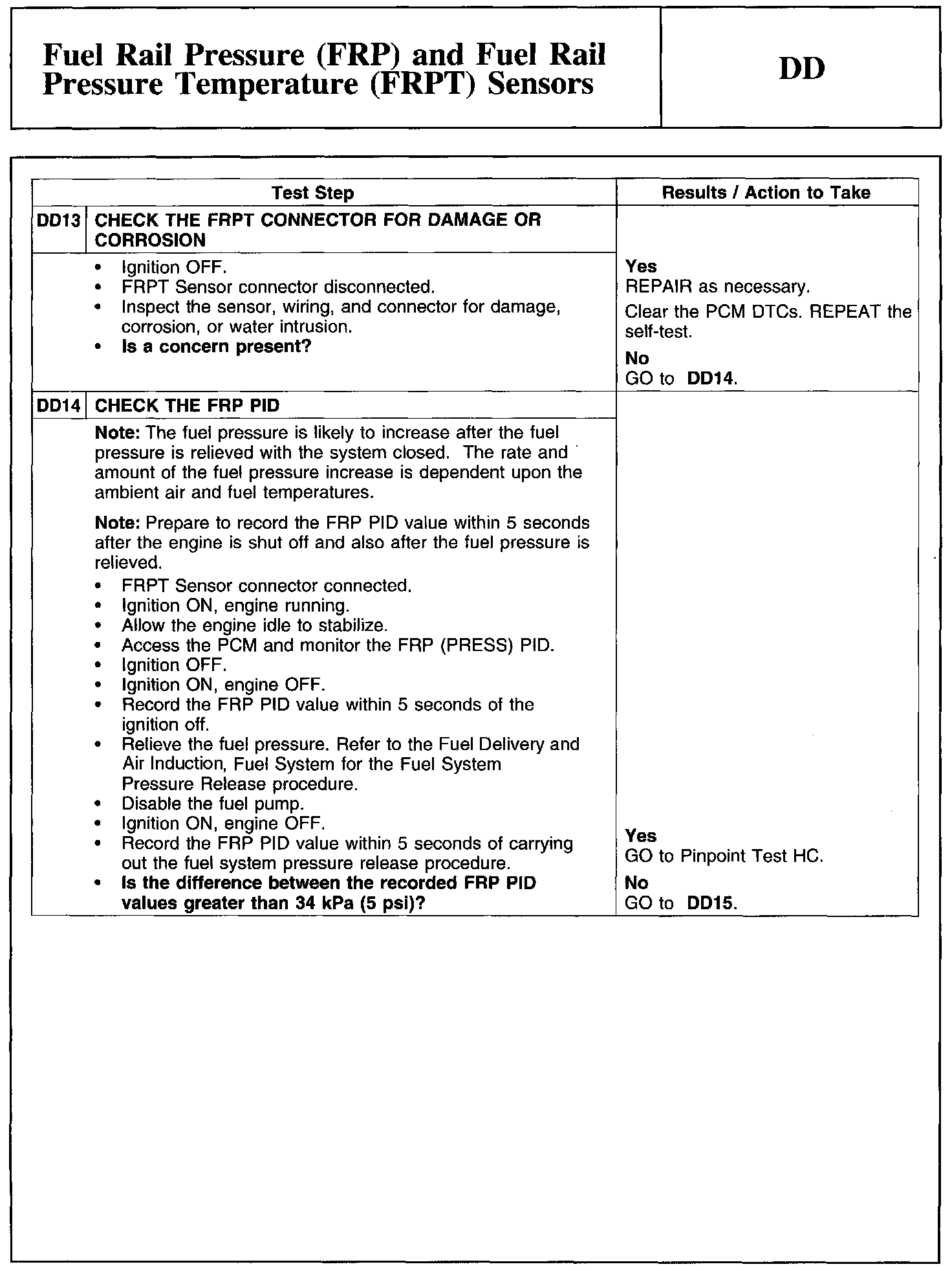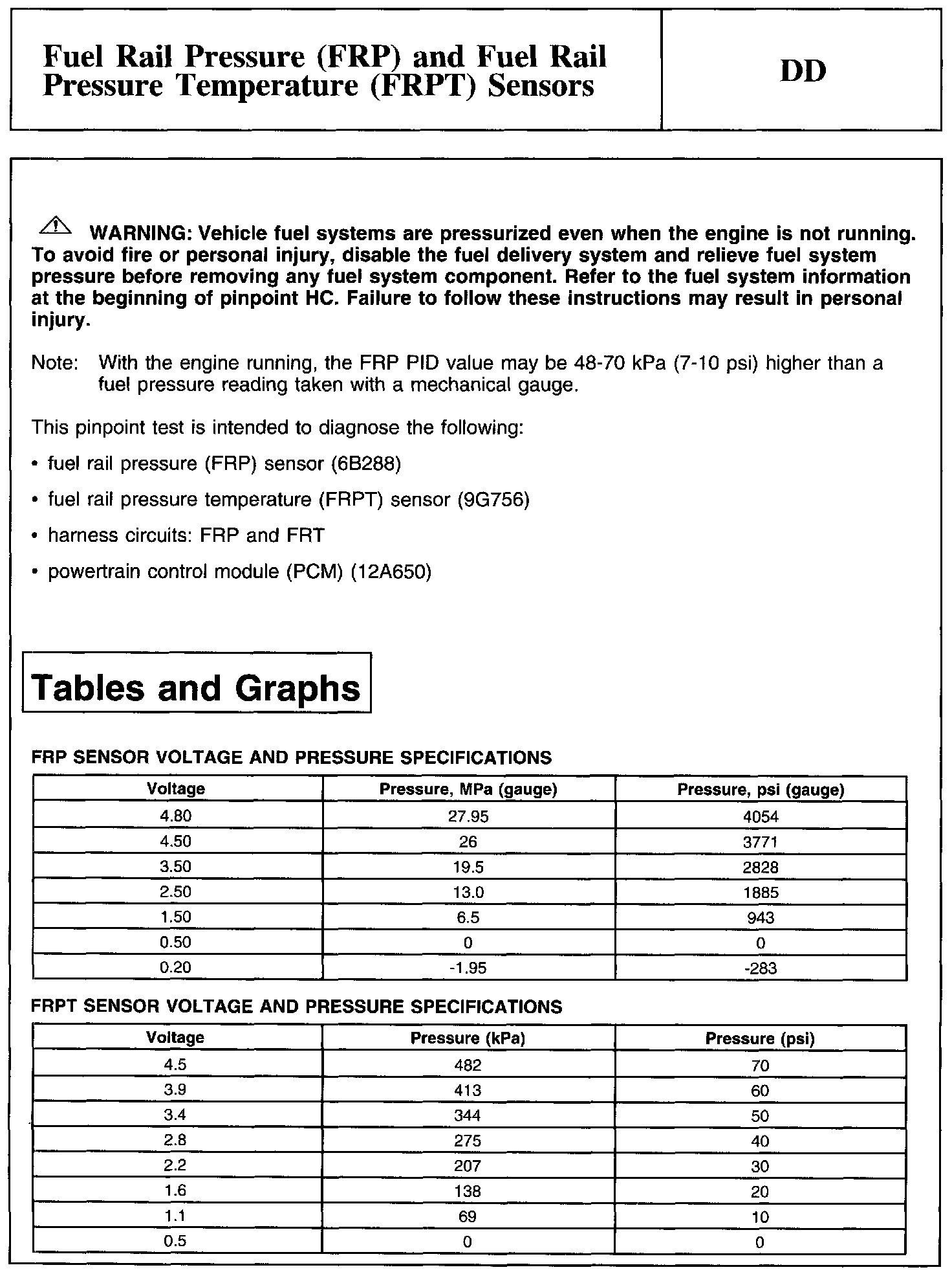 PINPOINT TEST DD: FUEL RAIL PRESSURE (FRP) AND FUEL RAIL PRESSURE TEMPERATURE (FRPT) SENSORSWarning, Note And Tables And Graphs: