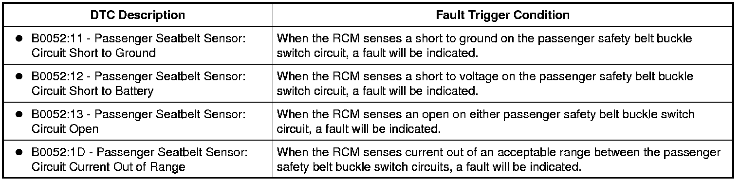 The Restraints Control Module (RCM) monitors the passenger safety belt buckle switch and circuits for the following faults: