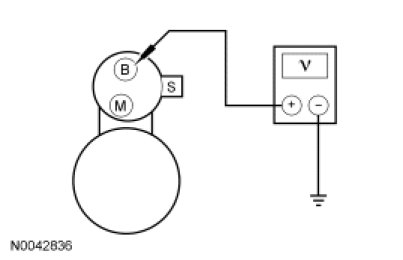 - Measure the voltage between the starter motor solenoid C197B-1, circuit CDC25 (BN/GN) and ground, while holding the key in the START position.