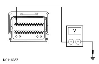 - Measure the voltage between Battery Junction Box (BJB) starter relay socket, pin 30, circuit SBB19 (BU/RD), harness side and ground.
