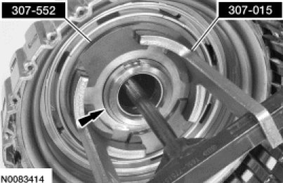7. Using the Clutch Spring Compressors, compress the direct clutch return spring and install the direct clutch return spring retainer.