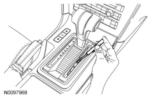 3. Using a suitable tool, push forward on the brake shift interlock override mechanism on the selector lever assembly, apply the brake pedal, press the button on the selector lever knob and move the selector lever into NEUTRAL.
