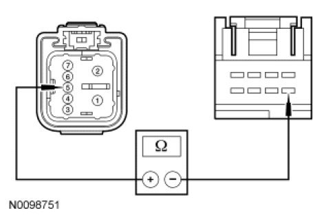 - Measure the resistance between RH front window motor C623-5, circuit CPW12 (GN/OG), harness side and RH front window control switch C604-3, circuit CPW12 (GN/OG), harness side.