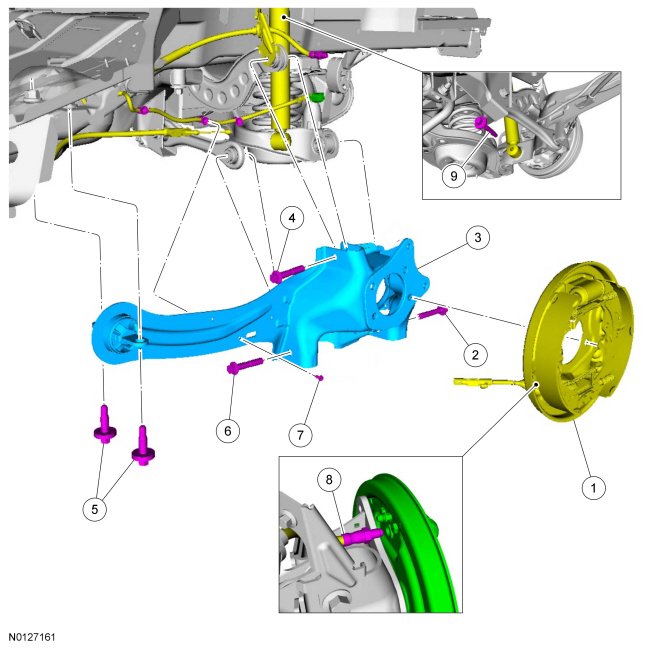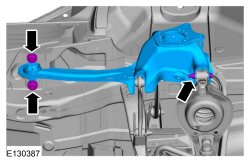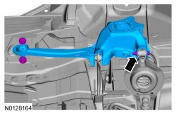 2. Remove and discard the 2 trailing arm bolts and remove the wheel knuckle and trailing arm assembly.