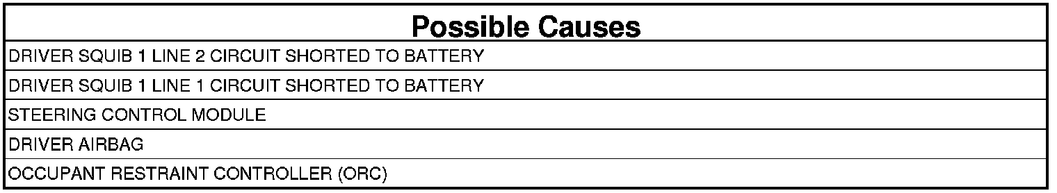 The Occupant Restraint Controller (ORC) monitors the voltage on the Driver Squib 1 circuits. The ORC will set this DTC if voltage is detected on the Driver Squib 1 circuits.