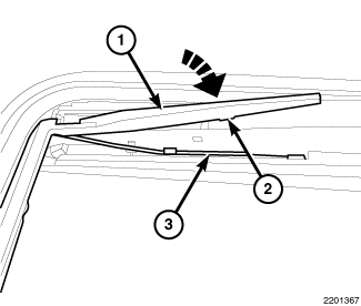 1. Position the wind deflector wires (2) into the holes of the closeout frame and rotate the wire forward and down.