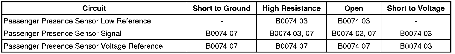 * The passenger presence module detects the voltage at the passenger presence sensor signal is less than 0.5 volt or greater than 4.5 volts for 500 milliseconds.