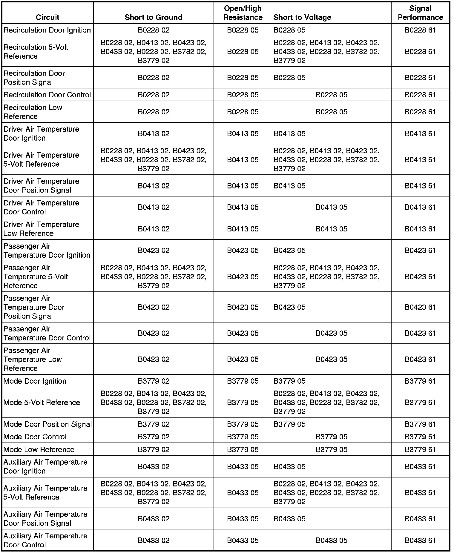 The actual door position differs from the commanded door position by more than 4 counts or the HVAC control module detects the door position signal circuit is less than 3 counts or greater than 253 counts.