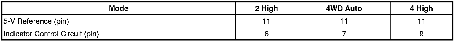 The all wheel drive (AWD) indicator circuit consists of a light emitting diode (LED), a LED feed circuit and a LED control circuit. The indicator dimming control circuit is the LED feed circuit and continuously supplies voltage to the 2 High, Auto 4WD, 4 Low and 4 High LEDs. When the AWD mode has been selected by the driver, the transfer case shift control module (TCCM) provides a ground through the AWD indicator control circuit illuminating the LED. The TCCM tests the AWD indicator circuit for unexpected voltage by monitoring the B+ supplied by the BCM on the indicator dimming control circuit, by grounding the AWD indicator control circuit for 2 seconds during the bulb test at key ON.