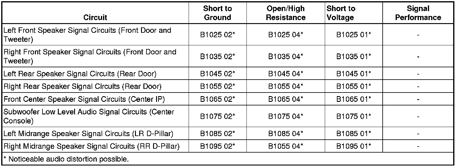 Important: This DTC can be set by either the radio or the amplifier. If the DTC was set by the radio, diagnose the appropriate audio output circuits to the speakers or the low level inputs to the amplifier (if equipped). If the DTC was set by the amplifier, diagnose audio output signals to the speakers from the amplifier. If equipped with rear seat audio (RSA) (U42), the RSA must be turned off to perform proper speaker testing.