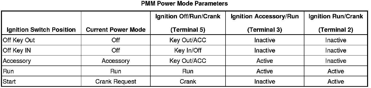 This vehicles power mode master (PMM) is the body control module (BCM). The ignition switch is a low current switch with multiple discrete ignition switch signals to the PMM for determination of the power mode. The PMM receives the ignition switch signals, and additionally a reference voltage signal from the BCM, through the ignition switch, and back to the BCM. There are redundancies within the PMM system that can allow operation of certain subsystems when there are faults in the ignition switch circuits. Other information such as serial data input from other modules and DTCs is also used to determine what power mode signals and information is transmitted by the PMM. The BCM logic uses all this information to identify the operators desired power mode and activate specific discrete signals, and serial data messages for the operation of many different subsystems as necessary. Other modules which have switched voltage inputs may operate in a default mode if the PMM serial data message does not match what the individual module can see from its own connections.