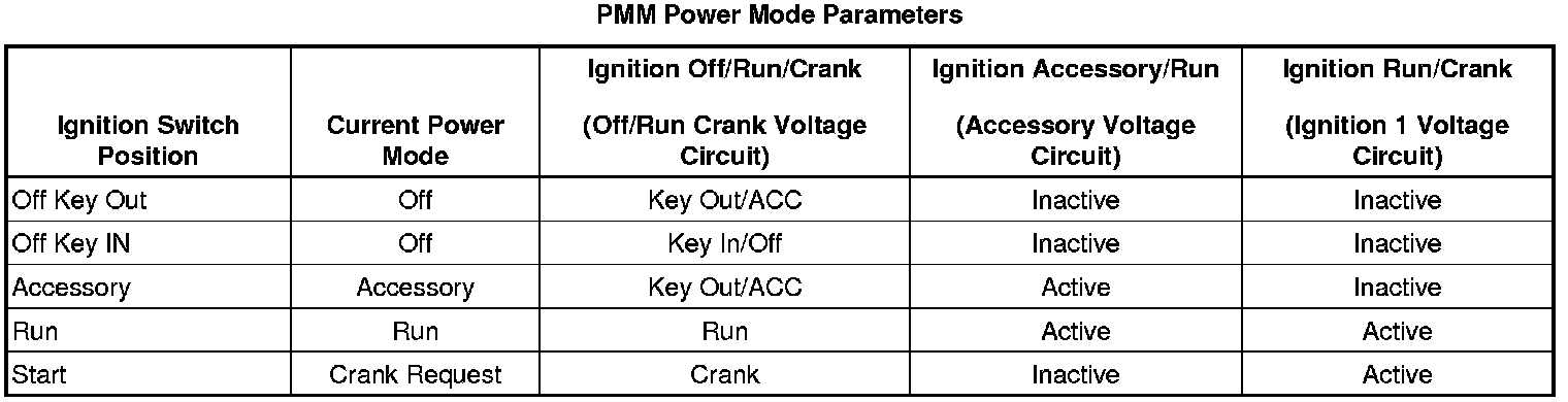 * The power modes and controls are determined using BCM logic. Comparing the Body Control Module Power Mode data display parameters listed in Circuit/System Verification will determine if there is a power mode fault.