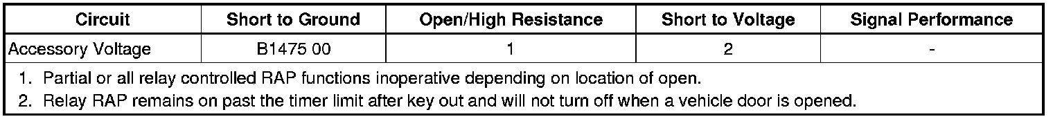 • If DTC B1475 remains set as current, test the accessory voltage circuit for a short to ground. If the circuit tests normal, replace the BCM.