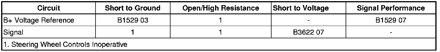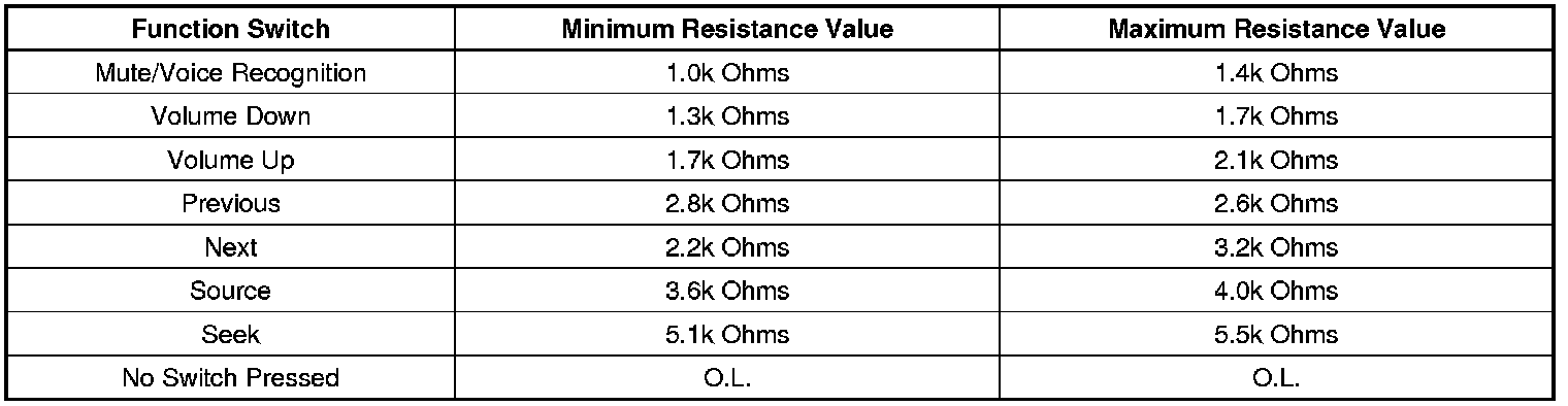 2. Test the resistance between the voltage reference terminal 3 and the signal terminal 4 while depressing the appropriate steering wheel controls switch listed below.