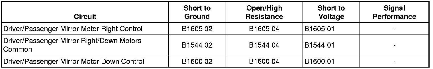 The Driver Door Module (DDM) or Passenger Door Module (PDM) controls the mirror horizontal and vertical motors through the use of bi-directional motor controls. When the mirror is commanded up and down, voltage or ground is supplied to the mirror vertical motor through the mirror motor vertical control circuit and voltage or ground is supplied through the mirror motor common control circuit.