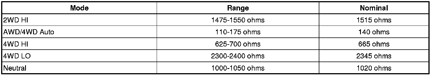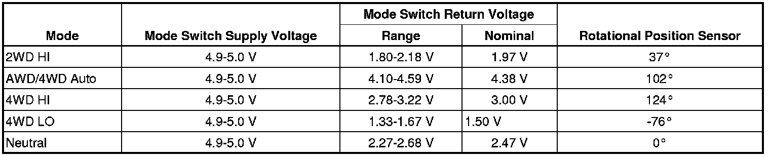The active transfer case mode switch circuit consists of 5 modes. The transfer case shift control module (TCCM) supplies a regulated 5 volts to the switch through the 5-volt reference circuit. The current travels through the specific resistor of the currently selected mode - each mode has its own resistor. The current is then returned to the TCCM through the switch signal circuit.