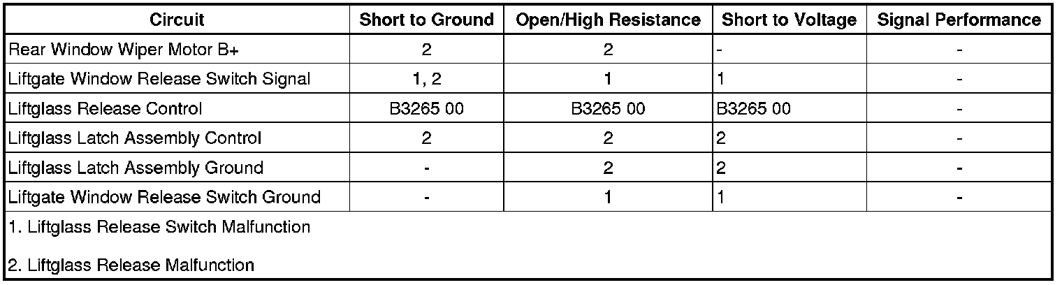 The liftglass release switch is an input to the body control module (BCM). The BCM supplies battery voltage to the signal circuit and when the release switch is activated the signal circuit voltage goes low. The BCM controls the liftglass release actuator through the rear wiper motor control module. When the release switch signal is activated the BCM applies battery voltage to the liftglass latch release signal circuit. The rear wiper motor control module supplies voltage to the release actuator through the liftglass release actuator control circuit.