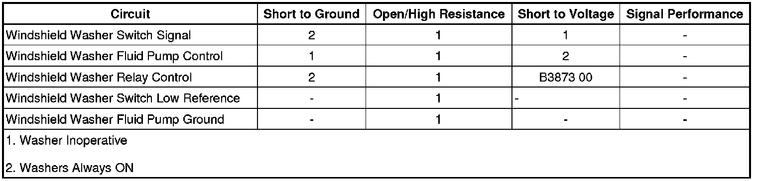 The windshield washer function is controlled by the body control module (BCM). When the washer switch is pressed, ground is applied through the switch contacts and the signal circuit to the BCM indicating the wash request. The BCM then applies ground through the control circuit to the coil side of the WSH Relay energizing the relay. With the relay energized, battery voltage from the WPR fuse is applied through the switch contacts of the relay, the WSW/PUMP Fuse, and the control circuit to the windshield washer fluid pump.
