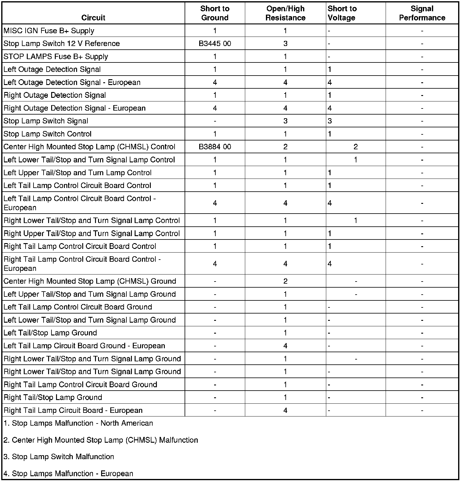 The BCM detects a short to ground in the CHMSL supply voltage circuit when the stop lamps are commanded ON.