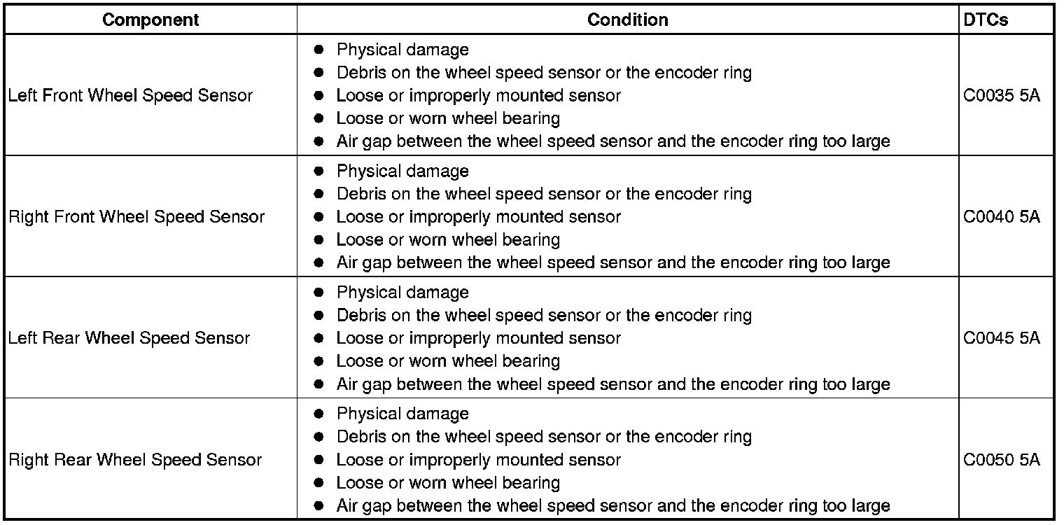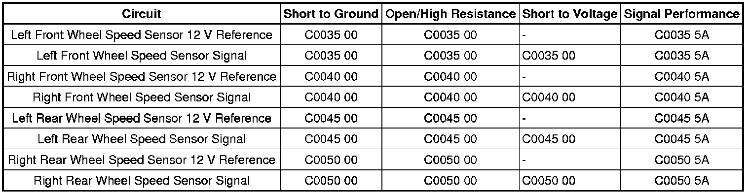 * A short to ground, or an open/high resistance is detected on the wheel speed sensor 12-volt reference circuit.