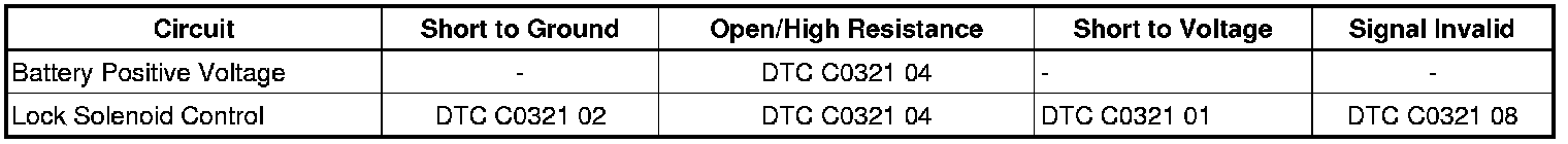 This DTC detects an open lock solenoid coil, open motor lock control circuit, or an open battery positive voltage circuit, or a short to voltage or ground on the lock solenoid control circuit.
