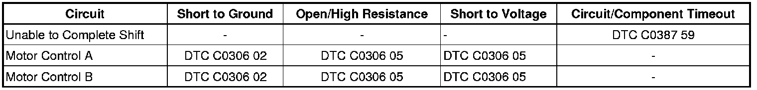 If the shift lever detent shaft were to bind, or there was a mechanical failure, or motor A control and motor B control were shorted together the shift would not be completed. This will cause the DTC to set in order to protect system components from damage.