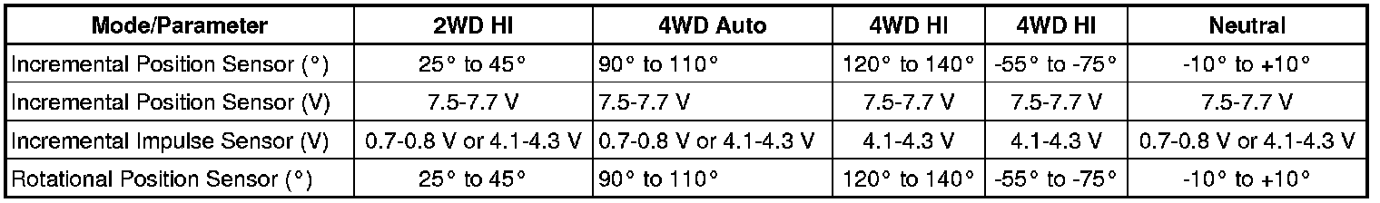 The transfer case incremental position sensor (IPS) and the transfer case two/four wheel drive actuator position sensor, also known as the rotational position sensor (RPS), both send transfer case mode/range position information to the transfer case shift control module (TCCM). Both sensors send this information as voltage signals which are converted to degrees by the TCCM software. If the two sensors disagree by greater than a predetermined amount the DTC will set.