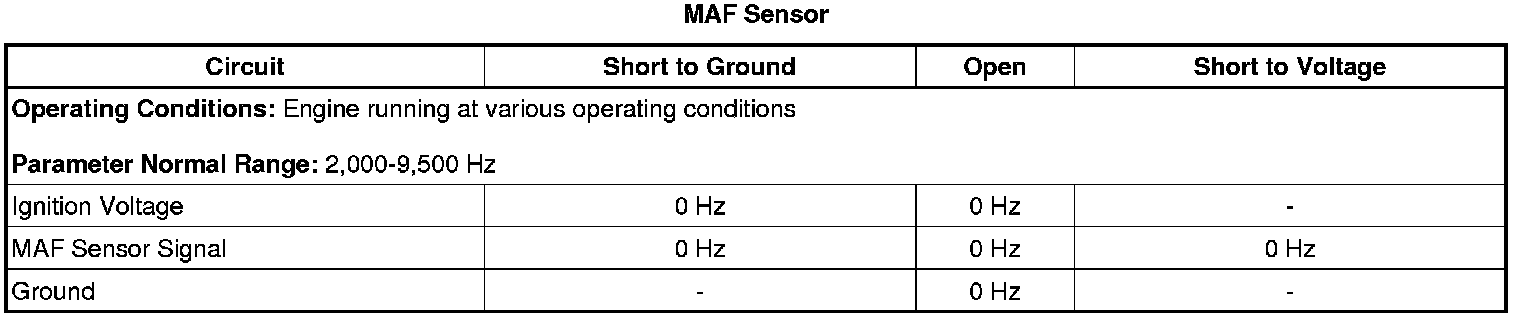 The ECM applies 5 V to the MAF sensor on the MAF sensor signal circuit. The sensor uses the voltage to produce a frequency based on the inlet air flow through the sensor bore. The frequency varies within a range of near 2,000 Hertz at idle to near 9,700 Hertz at maximum engine load.