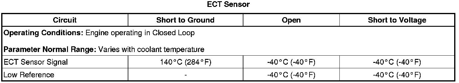 Measure and record the resistance of the ECT sensor at various ambient temperatures, then compare those measurements to the Temperature vs Resistance table. Refer to Temperature Versus Resistance Temperature Versus Resistance.