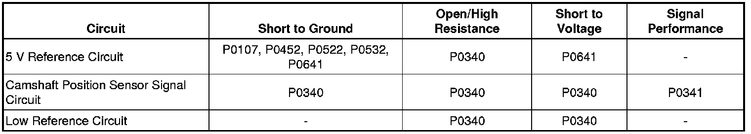 The 4X camshaft position sensor circuits consist of an engine control module (ECM) supplied 5 V reference circuit, low reference circuit, and an output signal circuit. The camshaft position sensor is an internally magnetic biased digital output integrated circuit sensing device. The sensor detects magnetic flux changes between the peaks and valleys of a 4-tooth reluctor wheel attached to the camshaft. As each reluctor wheel tooth rotates past the camshaft position sensor, the resulting change in the magnetic field is used by the sensor electronics to produce a digital output pulse. The sensor returns a digital ON/OFF DC voltage pulse of varying frequency, with two narrow, and two wide output pulses per camshaft revolution that represent an image of the camshaft reluctor wheel. The frequency of the camshaft position sensor output depends on the velocity of the camshaft. The ECM decodes the narrow and wide tooth pattern to identify camshaft position. This information is then used to sequence the ignition timing and fuel injection events for the engine. The ECM also uses camshaft position sensor output information to determine the camshaft relative position to the crankshaft, to control the camshaft position actuator if equipped, and for limp-home operation.