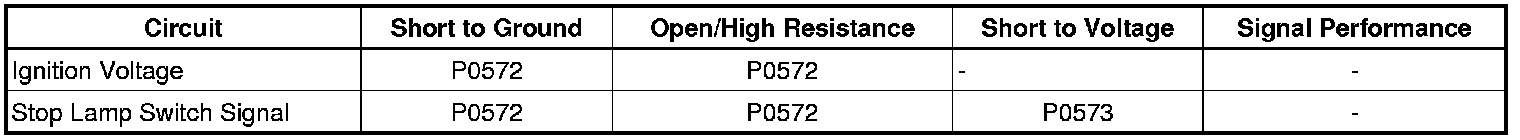 The ECM detects a low voltage signal on the TCC brake signal circuit for more than 2 seconds when the serial data message from the BCM indicates the brakes are applied. The ECM sets the DTC when the condition has been detected 8 out of 10 times.