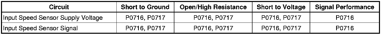 The automatic transmission (AT) input and output speed sensor (ISS and OSS) assembly each are part of a single harness. The ISS is a hall-effect type sensor. The ISS/OSS mounts to the control valve upper body assembly. The ISS sensor end faces the splines on the 1-2-3-4 and 3-5-R clutch housing outside diameter surface. The sensor receives 8.3-9.3 volts on the ISS/OSS supply voltage circuit from the control solenoid valve assembly. As the 1-2-3-4 and 3-5-R clutch housing rotates, the sensor produces a signal frequency based on the splines on the clutch housing outside diameter surface. This signal is transmitted through the ISS signal circuit to the control solenoid valve assembly. The control solenoid valve assembly uses the ISS signal to determine line pressure, transmission shift patterns, torque converter clutch (TCC) slip speed and gear ratio.