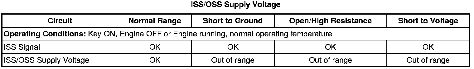 1. Ignition ON, verify with a scan tool the transmission ISS/OSS supply voltage test status parameter displays OK.